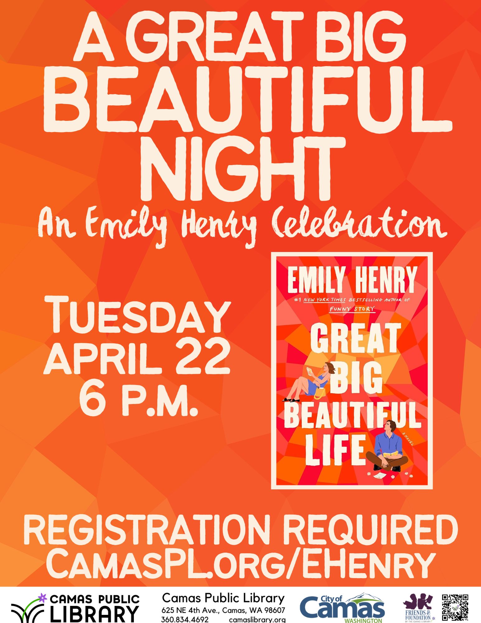 The Camas Public Library is hosting, “A Great Big Beautiful Night,” an adults-only celebration in honor of Emily Henry’s new book, “A Great Big Beautiful Life,” at 6 p.m. April 22. Enjoy themed activities like Emily Henry trivia and bookish bingo. Make your own romance-inspired bookmark and friendship bracelets, sip on cozy drinks, and chat about your favorite love stories. Enter a contest to win first dibs on the library’s copy of Henry’s new book. Register at CamasPL.org/EHenry or by calling the library at 360-834-4692.