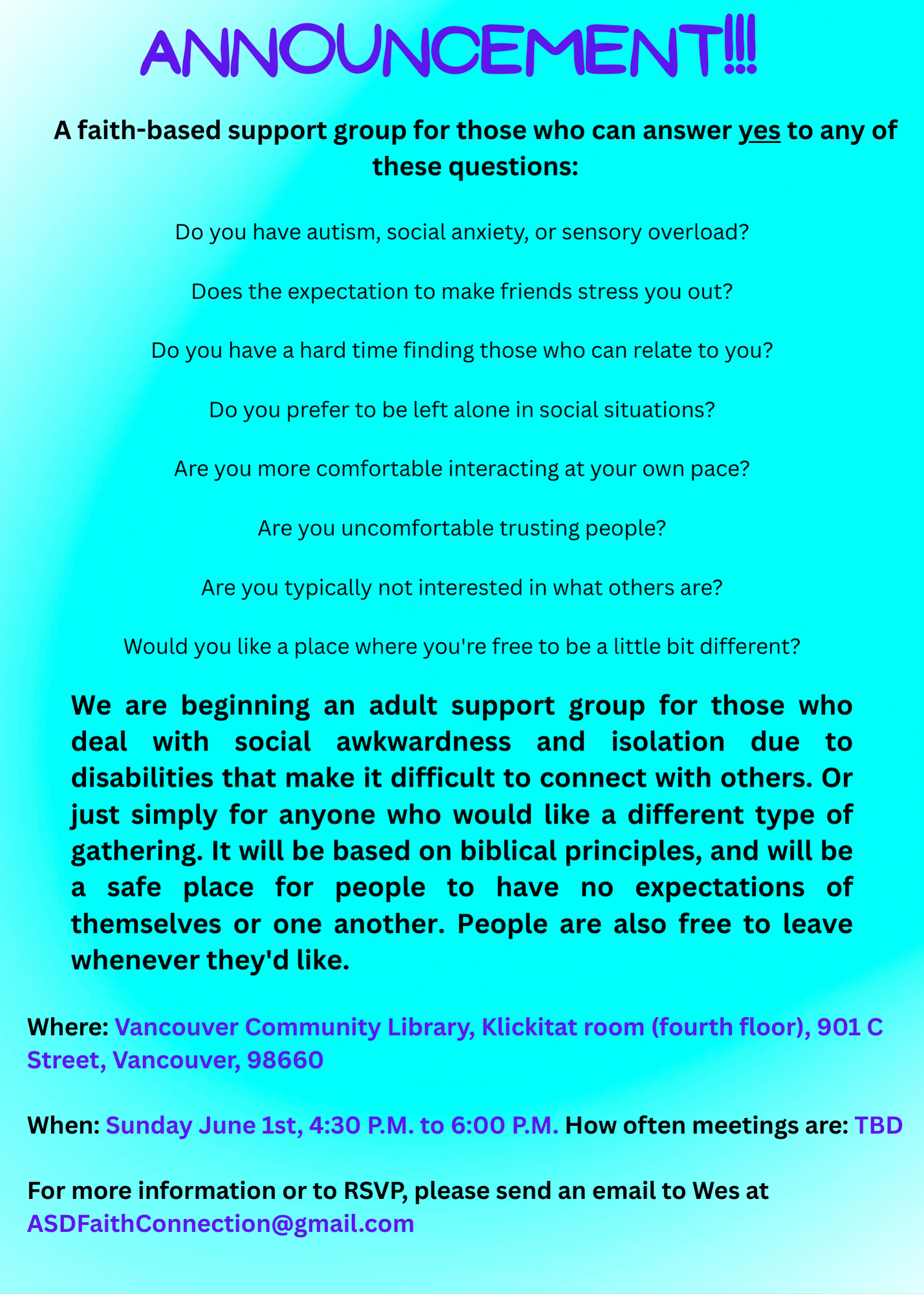 ASD Faith Connection will host a biblically based support group for adults with Autism Spectrum Disorder, social awkwardness or disabilities that make it difficult to connect with others. The group, which provides a safe, expectation-free environment, will meet from 4:30 to 6 p.m. June 1 in the Klickitat Room on the fourth floor of the Vancouver Community Library, 901 C St., Vancouver.