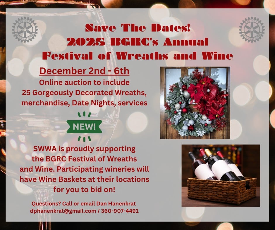 The Battle Ground Rotary Club’s Festival of Wreaths and Wine is Dec. 2-6 with a preview open house on Nov. 15. Proceeds support the Rotary Club’s outreach and community service projects. The auction will be fully online this year, though the Southwest Washington Winery Association will host in-person silent auctions for wine baskets at participating wineries. Register to browse handcrafted wreaths, curated gift baskets, local merchandise, services and Date Night packages. Learn more and bid at battlegroundrotary.org.