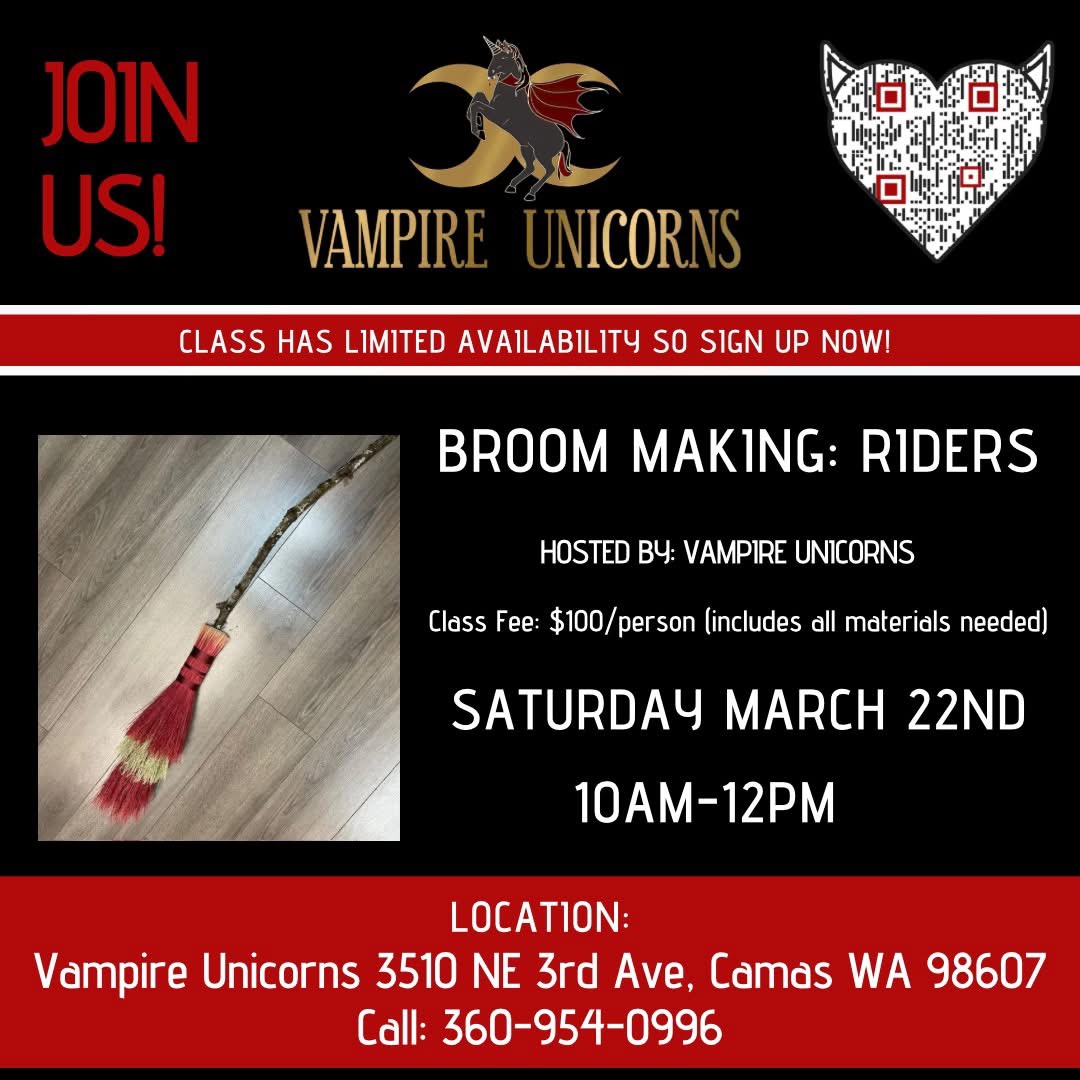 Vampire Unicorns, 3510 N.E. Third Ave., Camas, will offer a broom-making workshop from 10 a.m. to noon March 22. Attendees will learn how to make a standing broom or “rider” with locally sourced wood and broom corn with optional custom adornment. The cost is $100 per person and includes materials. Register at vampireunicorns.xyz/product/broom-making-riders-class/.