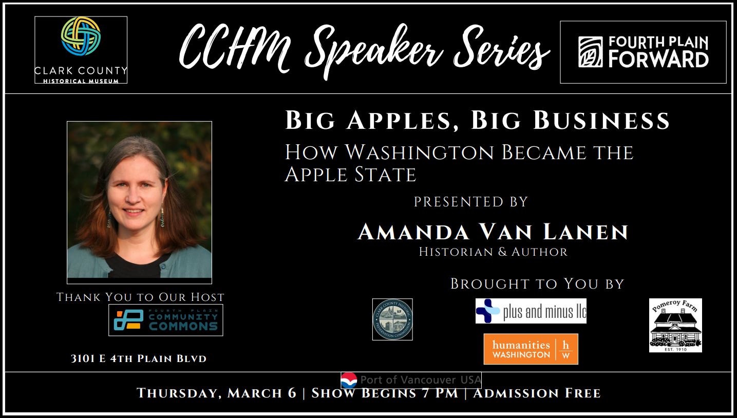 Clark County Historical Museum, Fourth Plain Forward and Humanities Washington invite the community to a presentation at 7 p.m. March 6 by history professor Amanda L. Van Lanen as part of the museum’s Speaker Series. “Big Apples, Big Business: How Washington Became the Apple State,” will delve into the history of Washington’s rise as the nation’s top apple producer and explore how the apple industry transformed from a regional crop to an industrialized commodity. Van Lanen is the author of “The Washington Apple: Orchards and the Development of Industrial Agriculture.” Doors open at 6:30 p.m. at Fourth Plain Commons, 3101 E. Fourth Plain Blvd., Ste. 101, Vancouver. Admission is free. For more details, call 360-993-5679 or email ou******@*******um.org.