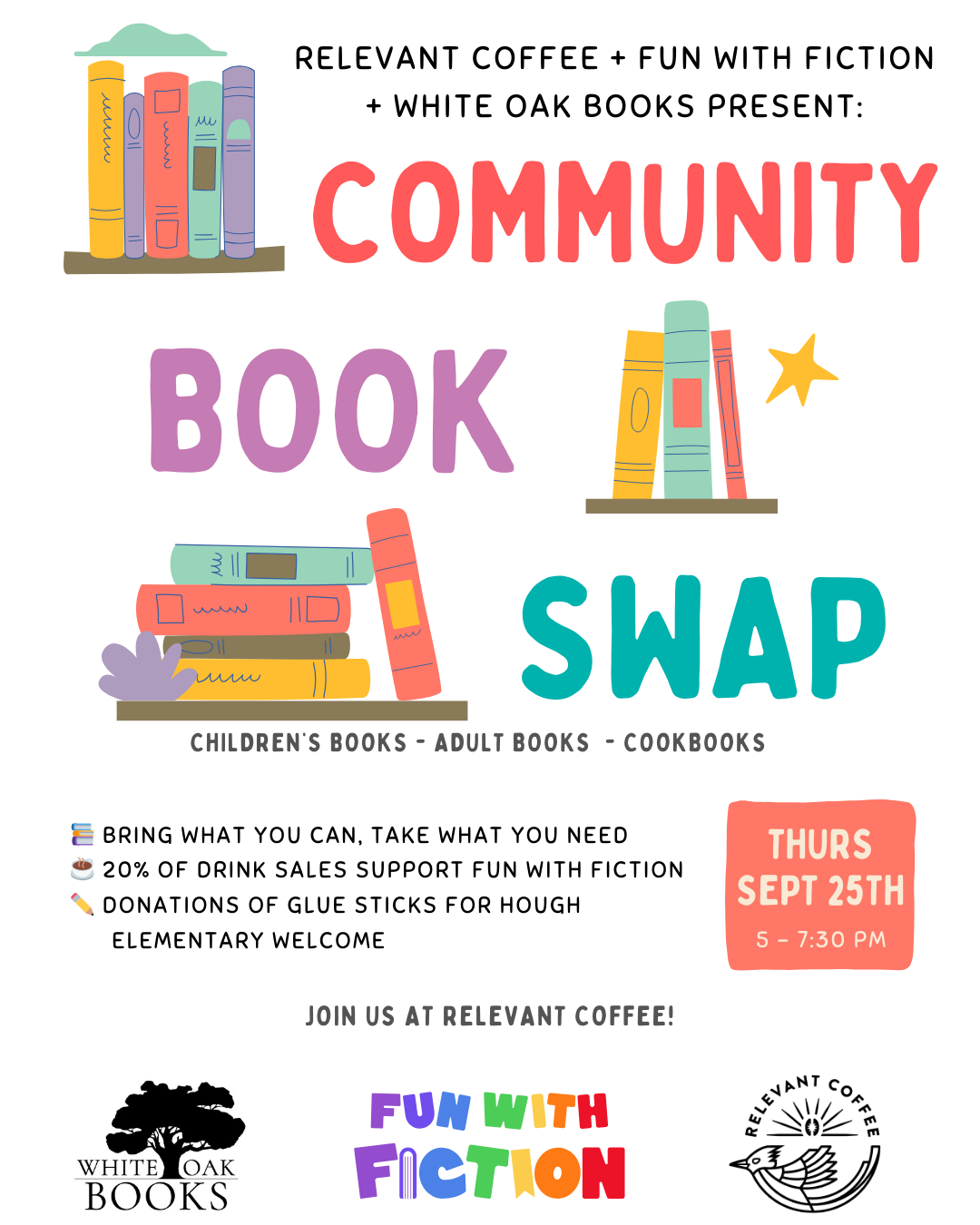 Relevant Coffee, 1703 Main St., Suite A, is teaming up with White Oak Books to bring to host a Community Book Swap from 5-7:30 p.m. Sept. 25. Enjoy an evening of book swapping and sipping coffee while supporting Fun With Fiction, a nonprofit that creates story-based care packages for children experiencing trauma, loss or instability. Bring books you’re ready to part with (kids’ books, adult reads, cookbooks) and take home something new to you. Twenty percent of drink sales will be donated to Fun with Fictions. Donations of glue sticks will also be accepted for Hough Elementary School.