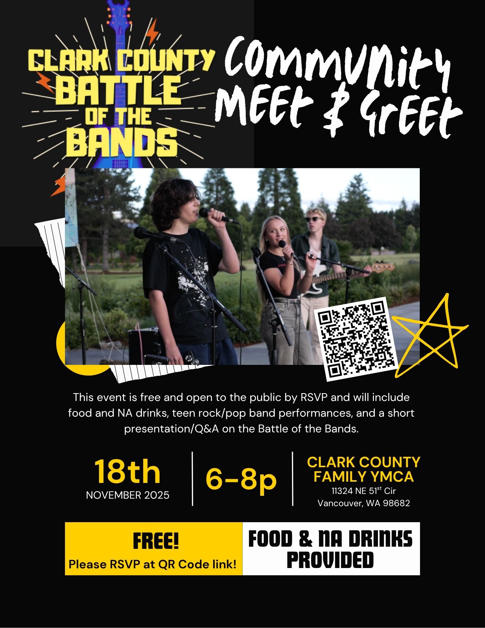 The first Clark County Battle of the Bands gave 45 local teenagers in nine bands the opportunity to perform onstage at the Columbia Tech Center Amphitheater before an audience of 250 people. Organizers are planning a Community Meet-and-Greet from 6-8 p.m. Nov. 18 for teens and their families interested in joining or attending next year’s competition. The event at the Clark County Family YMCA, 11324 N.E. 51st Circle, Vancouver, is free and open to the public by RSVP and will include food and non-alcoholic drinks as well as teen rock/pop band performances, a short presentation and question-and-answer session about next year’s Battle of the Band on May 30. RSVP by emailing Demarie Day at DD**@****cw.org.