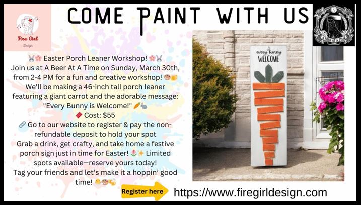 Fire Girl Design will host an Easter Porch Leaner Workshop at A Beer at a Time, 216 N.E. Third Ave., Camas, from 2 to 4 p.m. March 30. Attendees will create a 46-inch tall porch leaner featuring a giant carrot and the message, “Every Bunny is Welcome!” The cost is $55 per person. Drinks and food will be available to buy. Learn more at firegirldesign.com.