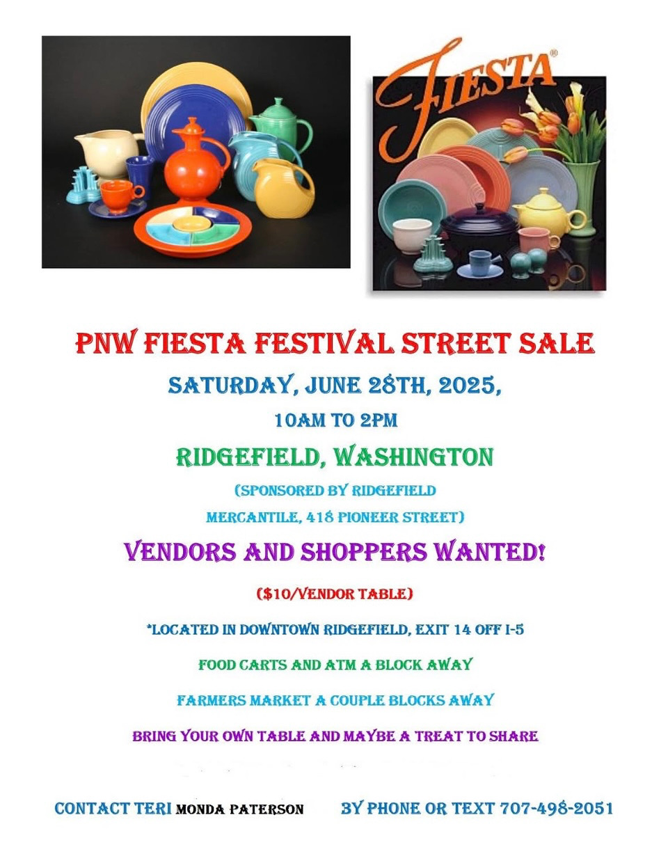 Ridgefield Mercantile will host a Fiestaware Festival Street Sale, a gathering of Fiestaware collectors to buy, sell, trade and admire, from 10 a.m.-2 p.m. June 28 in front of the store at 418 Pioneer St. in downtown Ridgefield. Vendor tables are $10. Contact Monda Paterson at 707-498-2051 for more details.