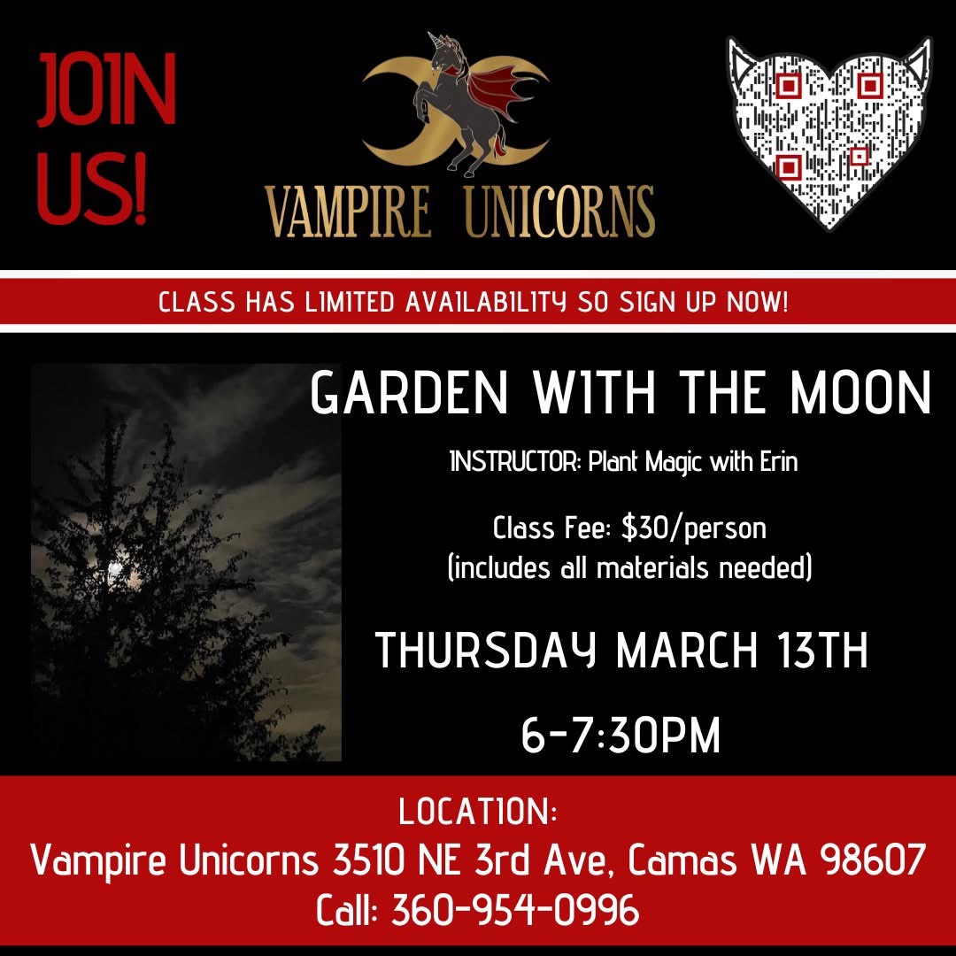 Vampire Unicorns, 3510 N.E. Third Ave., Camas, will offer a “Garden with the Moon” workshop from 6 to 7:30 p.m. March 13 to teach attendees to synchronize planting, pruning and harvesting with the moon’s cycles, applying ancient techniques of lunar timing to care for soil, seeds and plants. The cost is $30. Register at vampireunicorns.xyz/product/garden-with-the-moon-class/.