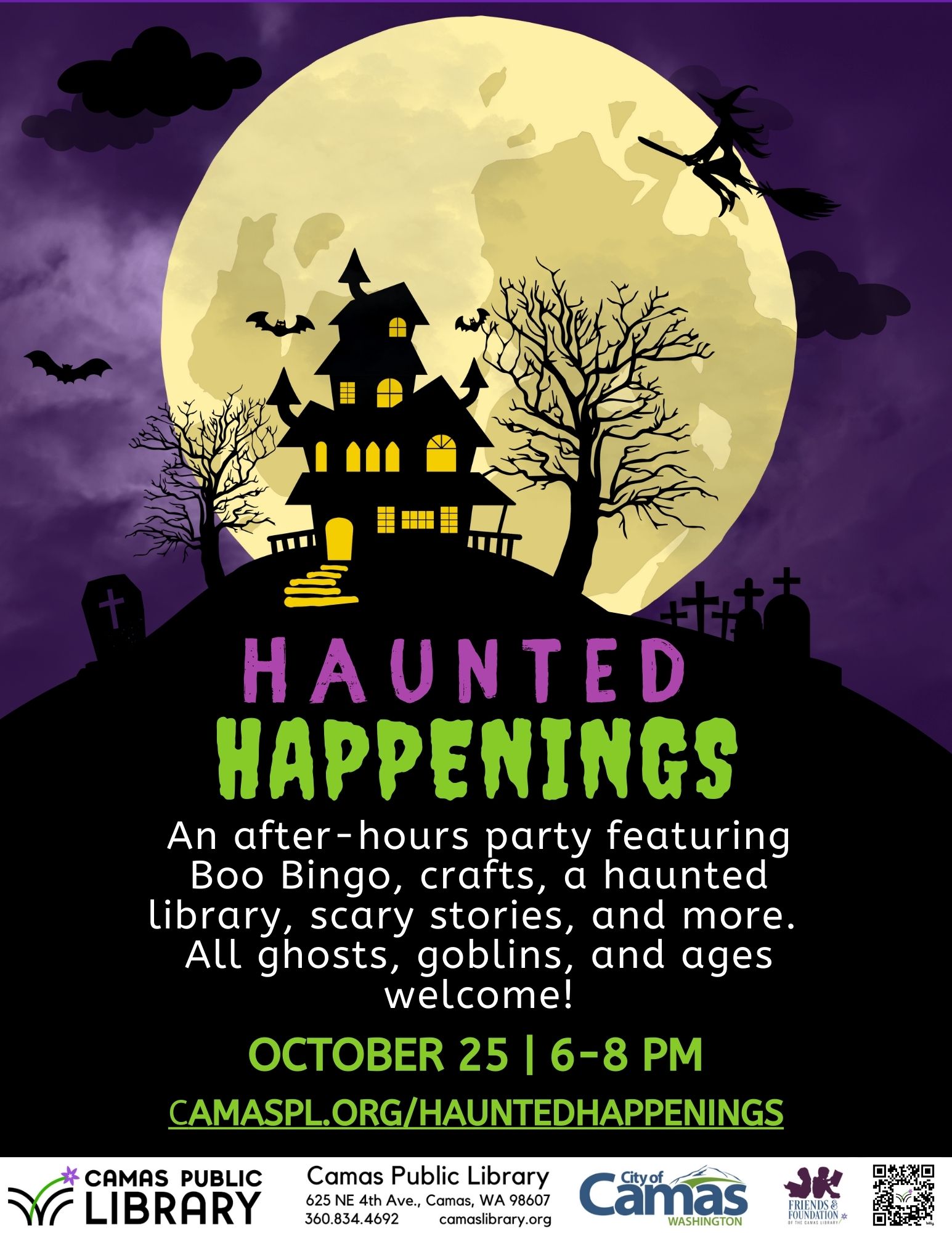 The Camas Public Library will host Haunted Happenings, an after-hours Halloween celebration for ghosts and ghouls of all ages 6-8 p.m. Oct. 25. Explore our Haunted Library, play a few rounds of Boo Bingo, get creative with Halloween crafts and hear not-too-scary stories. Kids and adults are encouraged to come in costume. Admission is free and no registration is required.