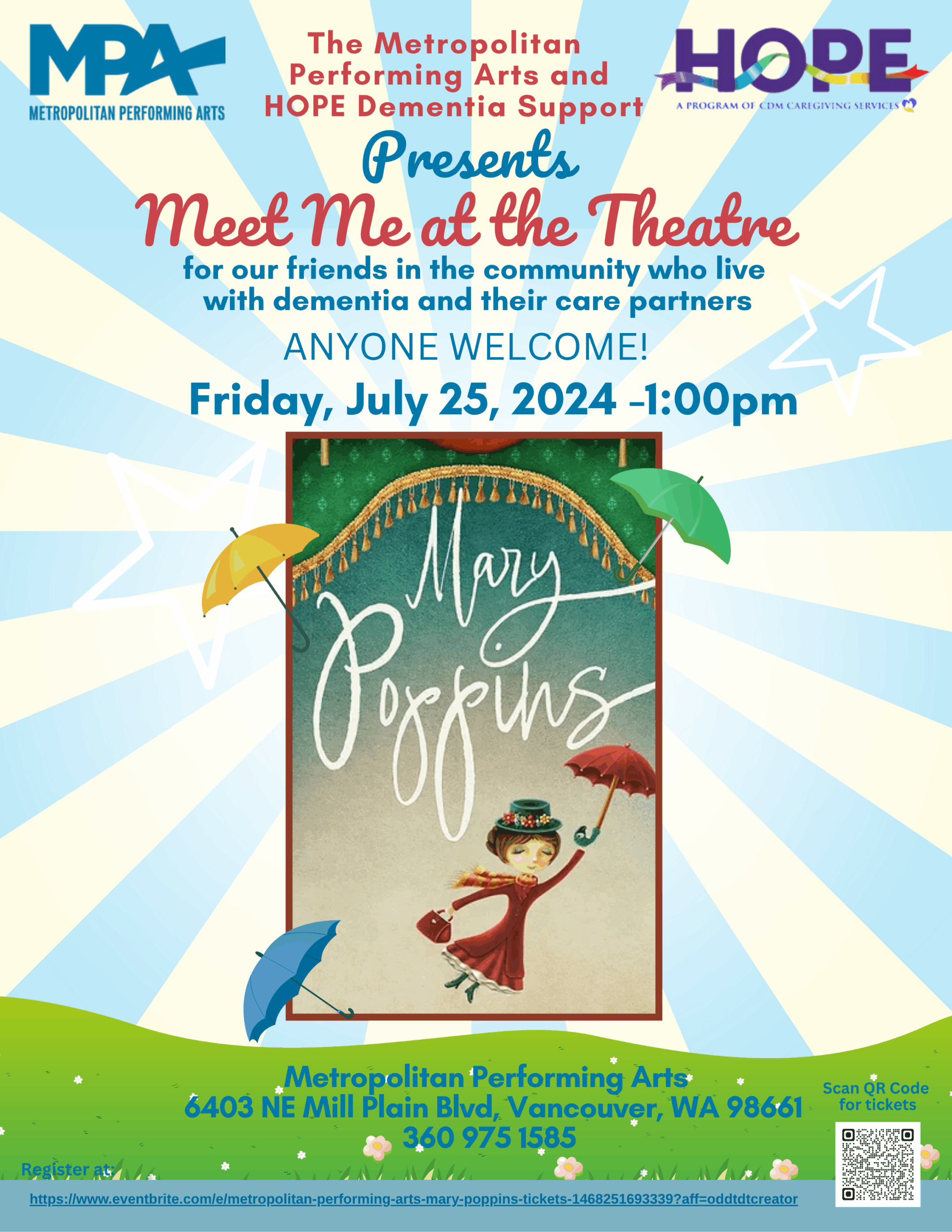 Crafted especially for PLWD and their care partners, this thoughtful performance offers gentle pacing, familiar songs, and a warm, inclusive atmosphere—allowing everyone to experience the joy of live theater. It’s a celebration of compassion, community, and the arts—where every moment is practically perfect in every way. HOPE Dementia Support thanks Metropolitan Performing Arts for making this whimsical afternoon possible.