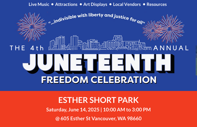 The 2025 Juneteenth Freedom Celebration is 10 a.m. to 3 p.m. June 14 in Esther Short Park in downtown Vancouver, a celebration of Black culture and community. Browse vendors, hear live musical performances from Wamba and JuJuba, make memories at the photo booth, play with Columbia Play Project and learn about Juneteenth history. Learn more at jfcvancouver.org.