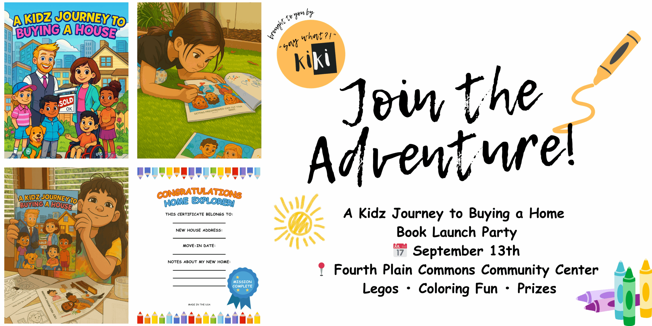 “A Kidz Journey to Buying a House” is a free family event blending hands-on activities with learning about money. Every child will get a coloring book, design and print a t-shirt and build miniature homes with Legos. Parents, grandparents, teachers, Realtors and Loan Officers are welcome to join and enjoy food and drinks. A professional photographer will be on site.