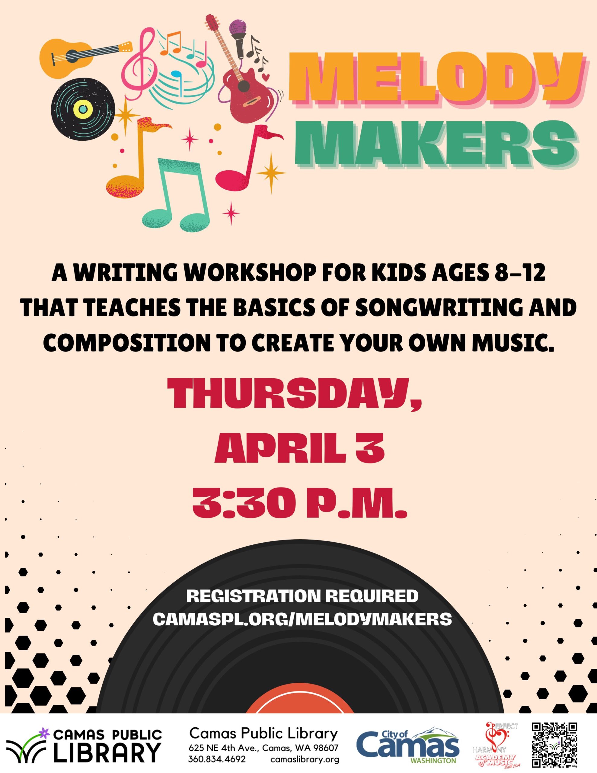 The Camas Public Library will host a “Melody Makers” songwriting workshop with Perfect Harmony Academy of Music for kids ages 8-12. Attendees to the free workshop from 3:30 to 4:30 p.m. April 3 will learn the basics of songwriting and composition to create their own music. Registration is required at CAMASPL.ORG/MELODYMAKERS or by calling the library at 360-834-4692.