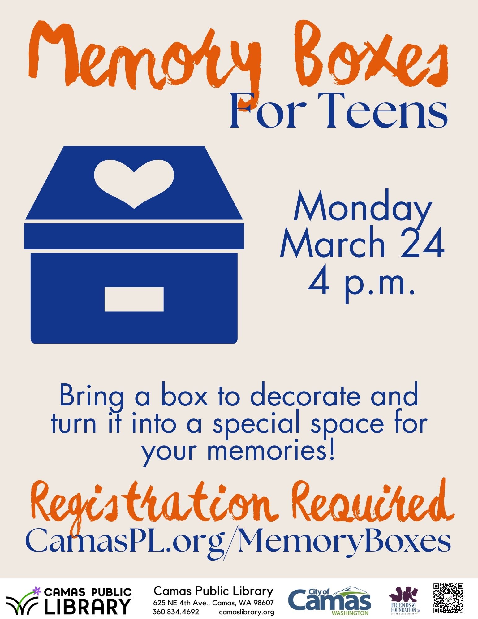 The Camas Public Library will offer a Memory Boxes for Teens workshop from 4 to 5 p.m. March 4. Teens in grades 6-12 will create a keepsake box to cherish their favorite memories. Teens should bring their own boxes and turn them into a personalized space to store photos, ticket stubs and other meaningful items. The library will provide materials for decorating. This program is for teens in grades 6-12. Register at CamasPL.org/MemoryBoxes or by calling 360-834-4692.