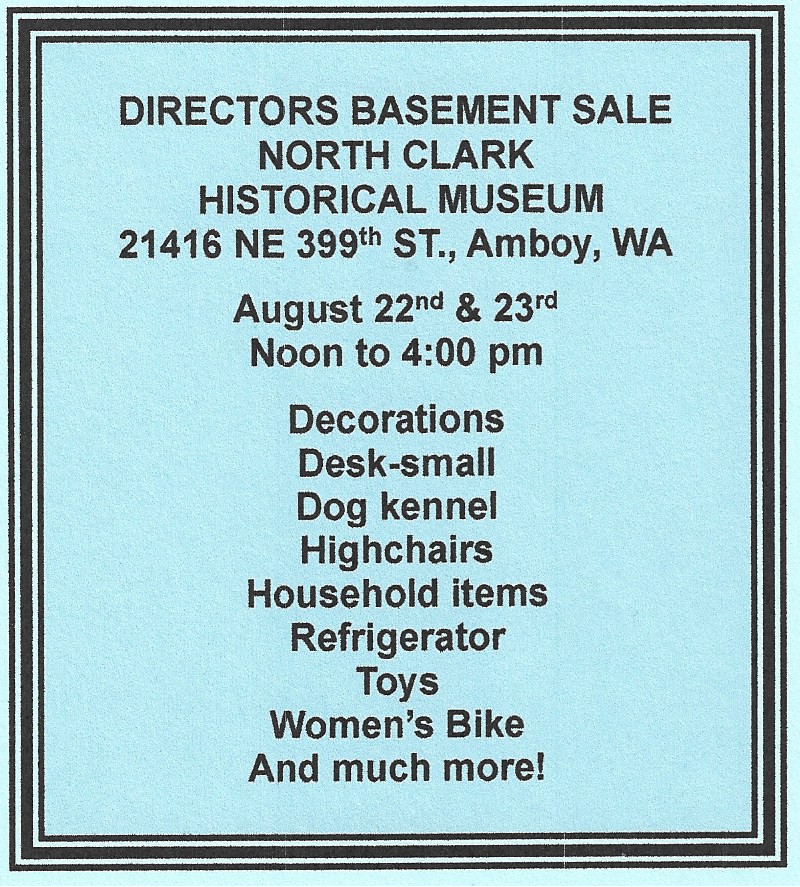 Noon to 4 p.m. Aug 22 and 23, North Clark Historical Museum will be holding a directors basement sale. Tickets are $1 and the proceeds go to the Capital Improvement Fund to maintain upkeep and repairs of the museum, such as a new roof. The event will also include the 2025 Museum Raffle Quilt made by the Chelatchie Quilters.