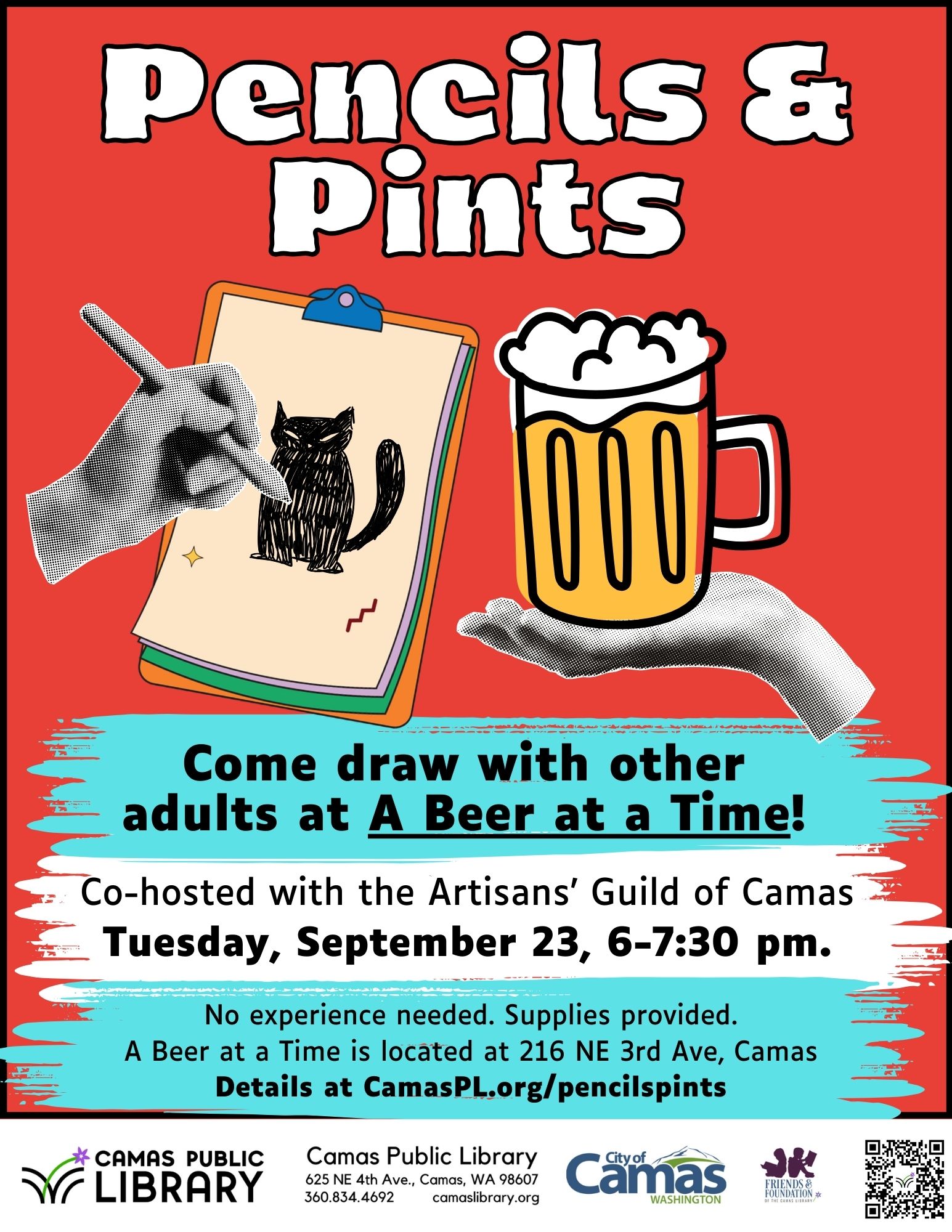 The Camas Public Library and Artisans’ Guild of Camas will host Pencil & Pints from 6-7:30 p.m. Sept. 23 at A Beer at a Time, 216 N.E. Third Ave. in Camas. This is a low-key meet-up where adults can draw, doodle or scribble while enjoying a beverage. Paper, pencils and clipboards will be available, but attendees are welcome to bring their own supplies. No registration is required. Learn more at CamasPL.org/pencilspints.
