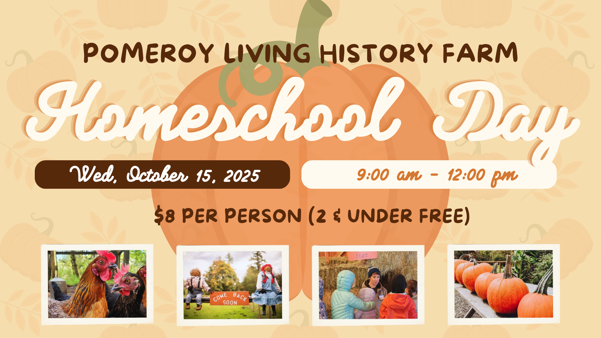 Pomeroy Farm will offer a Homeschool Open House, “Children’s Work and Play on a Pre-Electric Farm,” from 9 a.m. to noon Oct. 15, for homeschool, school co-op and family groups of fewer than 20 students. This program is designed for preschoolers through second graders. Kids will enjoy a tractor-pulled hayride through the farmās Pumpkin Lane with vignettes of āpumpkin peopleā with a stop at the Pumpkin Patch where students and adults can pick a pumpkin to take home. Kids can also visit chickens, goats and sheep, go through the hay bale maze and have a turn at the pumpkin flume. The grounds will remain open until 1 p.m. Admission is $8 per person; ages 2 and under are free.