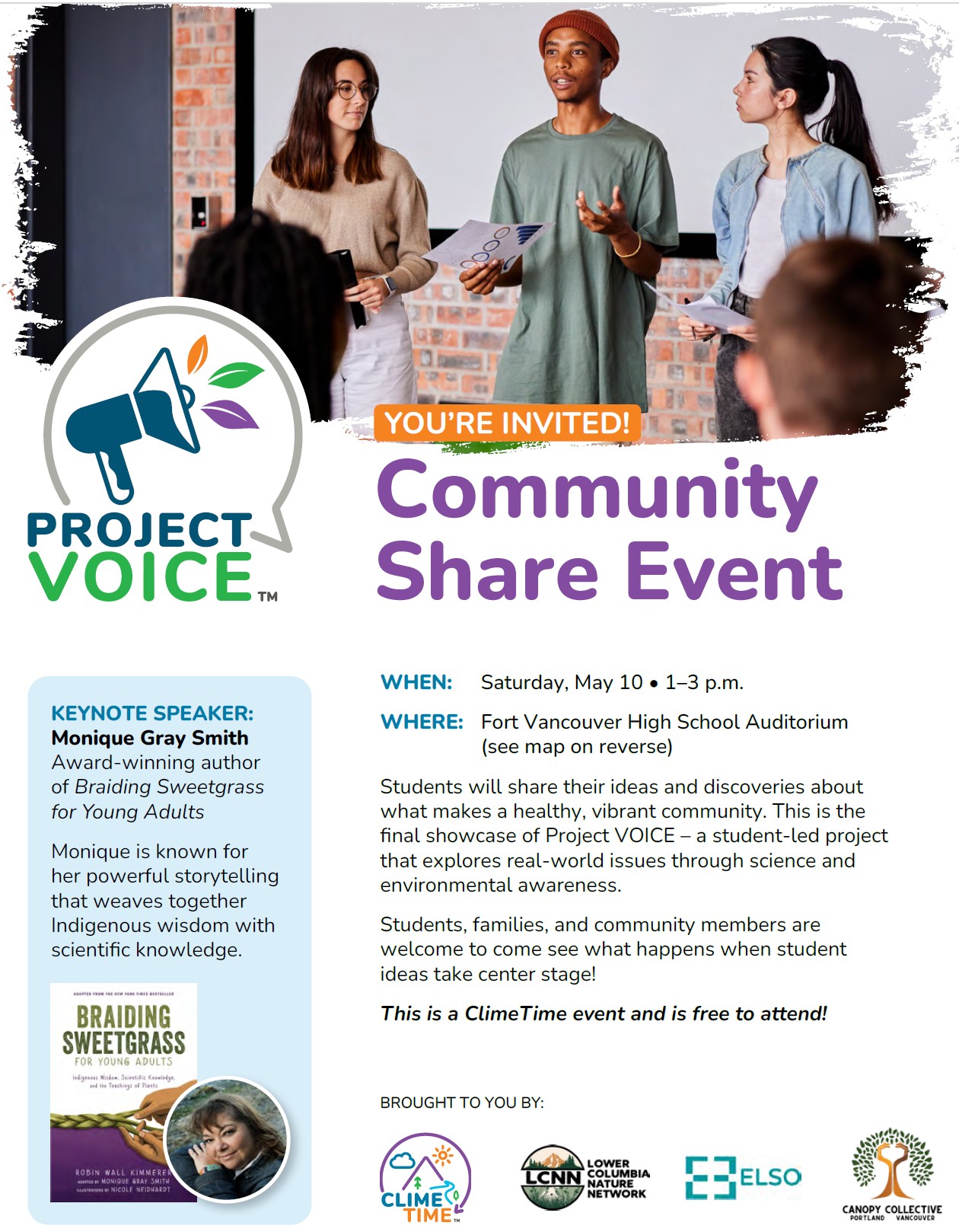 ProjectVOICE presents a free Community Share Event from 1 to 3 p.m. May 10 at Fort Vancouver High School Center for International Studies, 5700 E. 18th St., Vancouver. Students will share their ideas and discoveries about what makes a healthy, vibrant community. This is the final showcase of a student-led project that explores real-world issues through science and environmental awareness. The keynote speaker is Monique Gray Smith, author of “Braiding Sweetgrass for Young Adults,” sponsored by the Portland-Vancouver Canopy Collective. Regional partners from the Lower Columbia Nature Network will be on hand to help people connect to nature through stewardship opportunities, workshops, training and nature adventures.