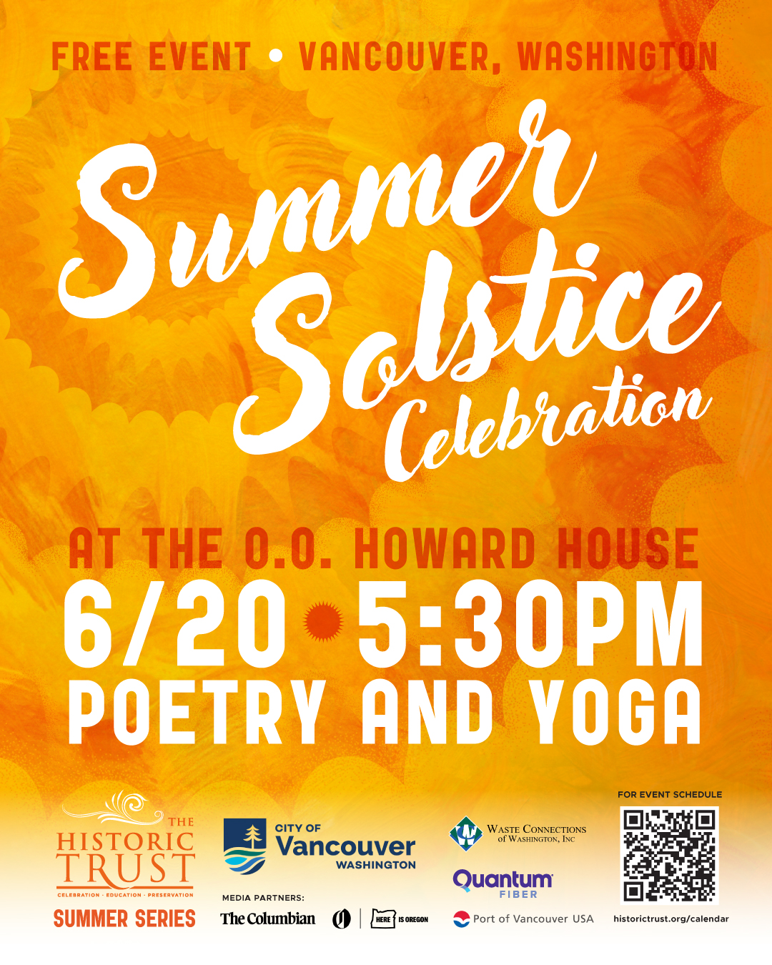 The Historic Trust presents the Summer Solstice Celebration from 5:30-8:30 p.m. June 20 at the O.O. Howard House, 750 Anderson St. A, Vancouver. Welcome the longest day of the year and the beginning of summer with solstice-themed poetry and spoken word, gentle yoga, sound meditation and craft activities. This drop-in event is free. Guests should bring yoga mats if planning on doing yoga. The schedule is as follows: