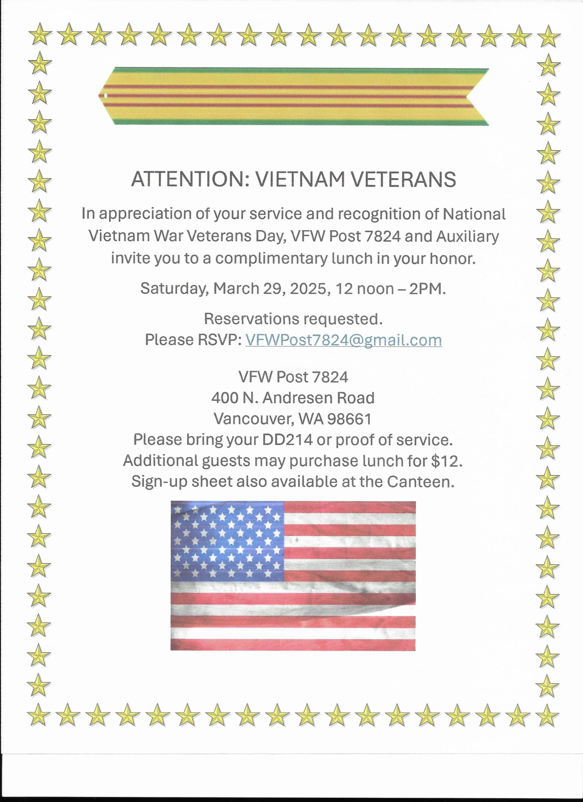 Veterans of Foreign Wars Post 7824, 400 N. Andresen Road, Vancouver, will host a complimentary lunch for Vietnam veterans from noon to 2 p.m. March 29 in honor of National Vietnam War Veterans Day. Please bring DD214 or proof of service. Additional guests may eat for $12. RSVP to vf*********@***il.com.