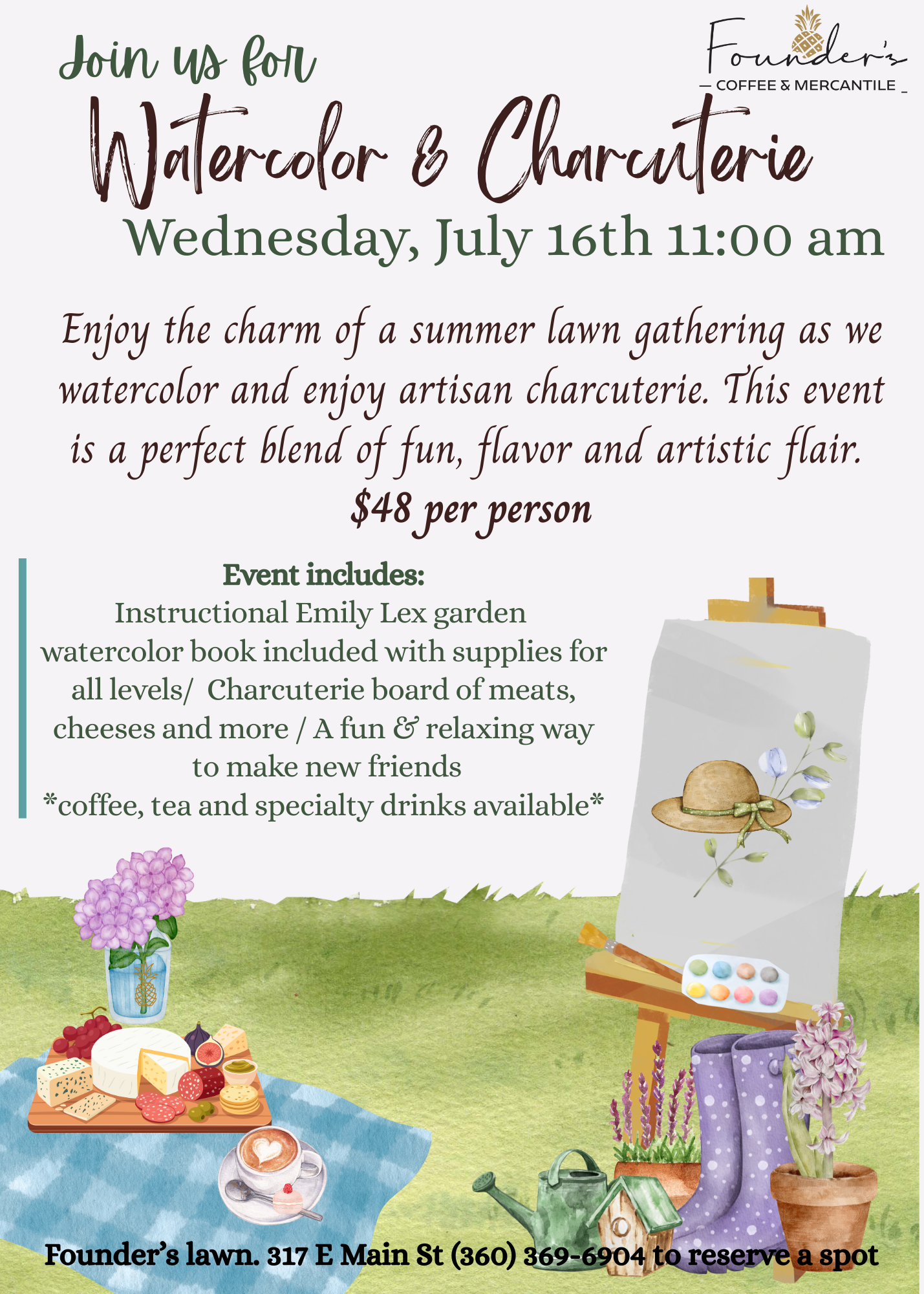 Founder’s Coffee and Mercantile will host an outdoor Watercolor and Charcuterie event at 11 a.m. July 16 at 317 E. Main St., Battle Ground. Enjoy charcuterie while painting in local artist Emily Lex’s watercolor book, which participants can take home. The cost is $48. Learn more at facebook.com/foundersmercantile/.