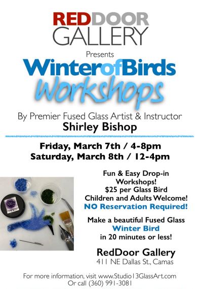 RedDoor Gallery, 411 N.E. Dallas St., Camas, will host Shirley Bishop’s “Winter Birds” drop-in fused glass workshops from 4 to 8 p.m. March 7 and noon to 4 p.m. March 8. There’s no need to register and the cost is $25 per bird. Each piece takes about 20 minutes to make and guests can choose from robins, hummingbirds or cardinals. The class is open to adults and children. For more details about Bishop’s fused glass classes, visit www.studio13glassart.com. For more information about RedDoor Gallery, visit reddoorgallerycamas.com or call 360-281-8720.