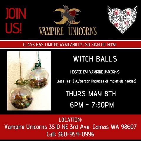 Vampire Unicorns, 3510 N.E. Third Ave., Camas, is hosting a Witch Ball workshop from 6 to 7:30 p.m. May 8. Attendees will create their own witch balls by choosing herbs, flowers, and crystals to put in the clear glass ball, then decorating it with ribbons and charms to hang in a window. Register at vampireunicorns.xyz/product/witch-ball-class/. The cost is $30 and includes all materials. Learn more at vampireunicorns.xyz.
