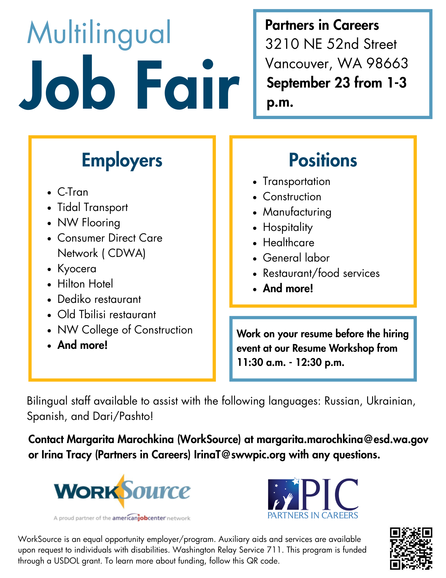 Partners in Careers and WorkSource will host a multilingual hiring event for immigrants, refugees and non-English speakers from 1 p.m.-3 p.m. Sept. 23 at Partners in Careers, 3210 N.E. 52nd St., Vancouver. Russian, Ukrainian, Spanish, Dari and Arabic translators will be available onsite. Candidates should dress for a job interview, bring resumes and be prepared […]