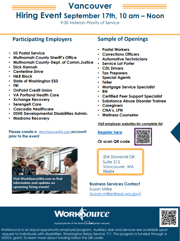 WorkSource will host a hiring event from 10 a.m. to noon Sept. 17 at 204 Stonemill Drive, Suite 215, Vancouver. Candidates should dress for a job interview, bring copies of their resume, and be prepared to meet and interview with hiring managers. Job seekers are encouraged to open a free account on www.worksourcewa.com. Candidates can […]