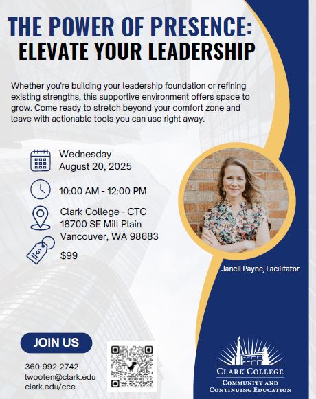The Power of Presence: Elevate Your Leadership is an interactive workshop designed to help professionals strengthen their communication skills, boost confidence, and develop a more impactful leadership presence. Ideal for emerging and experienced leaders alike. Event will be held at the Clark College Columbia Tech Center Campus from 10 a.m. to noon Aug. 20.