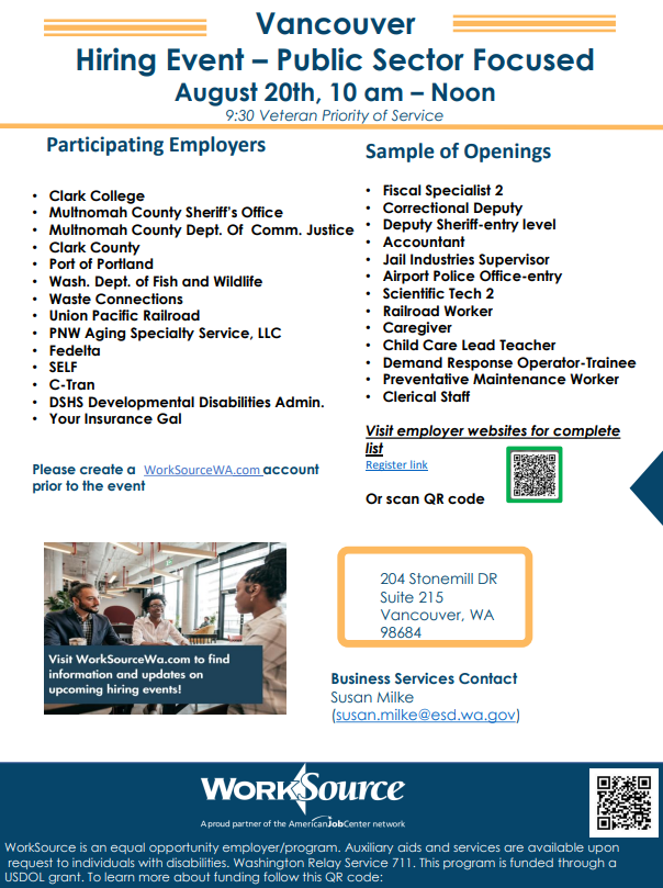 WorkSource will host a hiring event from 10 a.m. to noon Aug. 20. Job seekers can meet local employers. Candidates should dress for a job interview, bring copies of their resume, and be prepared to meet and interview with hiring managers. For more information about the event, contact susan.milke@esd.wa.gov or 360-735-4981 or stop by the […]