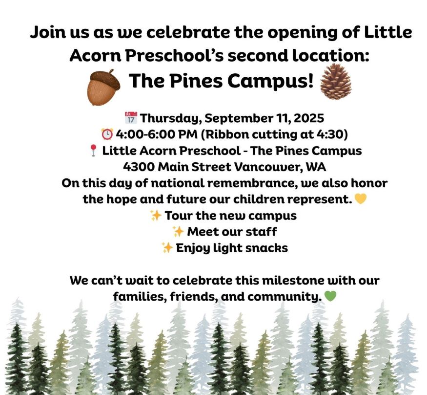 Little Acorn Preschool will host a ribbon-cutting celebration from 4-6 p.m. Sept. 11 to celebrate the opening of its new Pines campus, 4300 Main St., Vancouver.