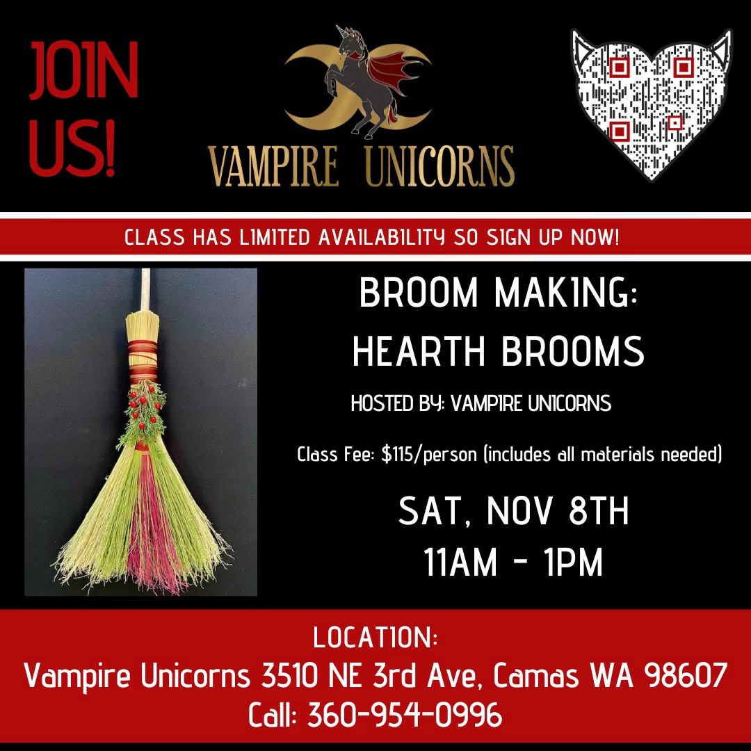 Vampire Unicorns will host a Hearth Broom Workshop from 11 a.m. to 1 p.m. Nov. 8. Hearth Brooms are associated with good luck, house blessings and protection from negative influences. Students will learn how to make their own hearth brooms wooden handles, broom thread and hand-dyed broomcorn (sorghum). The cost is $115 and includes all […]