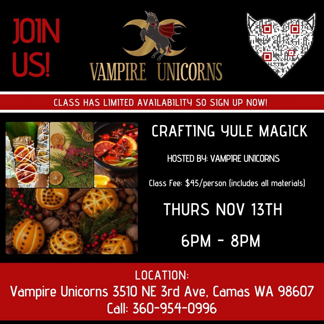 Celebrate the warmth and light of Yule with a Crafting Yule Magick class, 6-8 p.m. Nov. 13 at Vampire Unicorns, 3510 N.E. Third Ave., Camas. Students will learn about different Yule traditions while creating an array of festive items, including simmer pots, fragrant pomanders, and purifying burn bundles. Students will be able to take their handmade […]