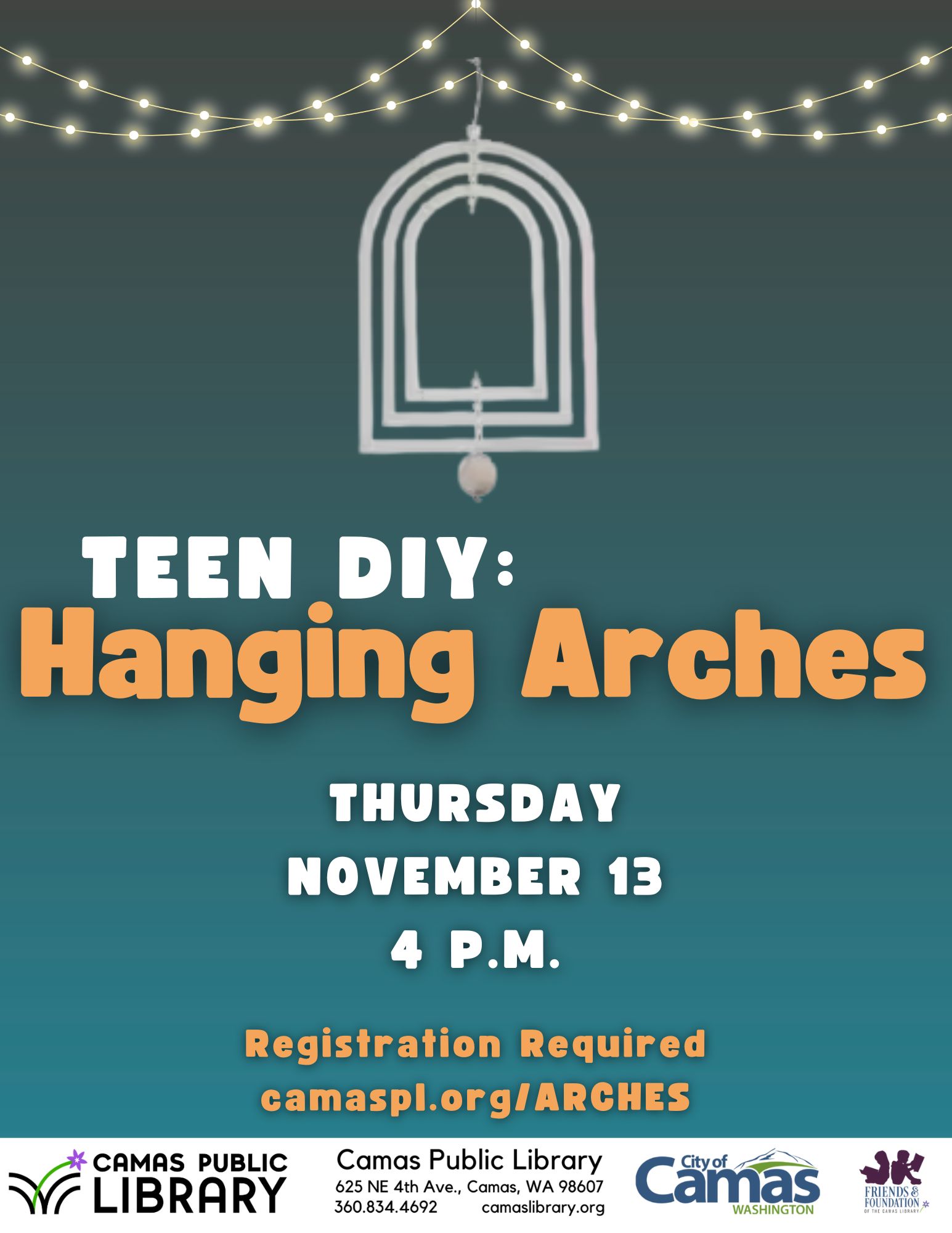 The Camas Public Library will offer a Hanging Arches for Teens workshop from 4-5:30 p.m. Nov. 13. Teens in grades 6-12 will create a painted arch to hang in their rooms. The library will provide the hanging arches, paints and  supplies to personalize it. Register at camaspl.org/ARCHES or by calling 360-834-4692.