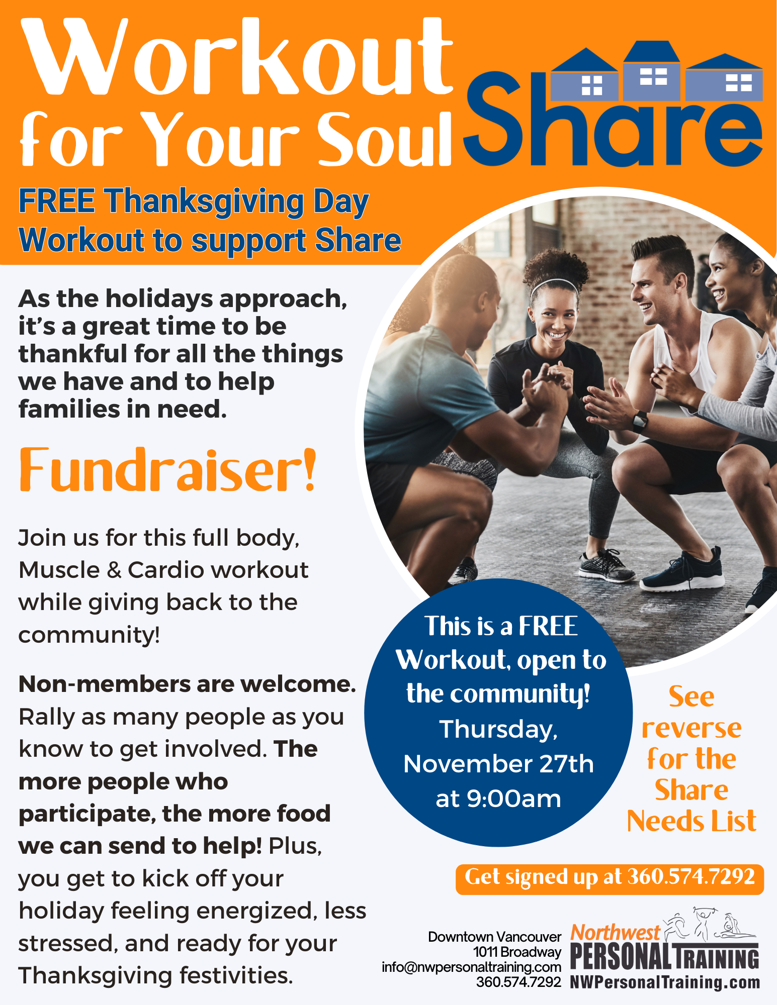NW Personal Training will host Workout for Your Soul from 9-10 a.m. Thanksgiving day, Nov. 27, at 1011 Broadway, Vancouver. Enjoy a free, full-body muscle and cardio workout and bring food and clothing donations for Share Vancouver. Sign up at 360-574-7292.
