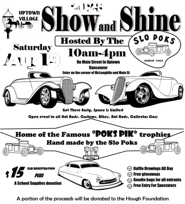 The Slo Poks Car Club will host the Show and Shine car show from 10 a.m. to 4 p.m. Aug. 9 on Main Street in Vancouver's Uptown Village. The event is open to all hot rods, custom cars, bikes, rat rods and collector cars. There will be raffle drawings all day, giveaways, goodie bags for […]