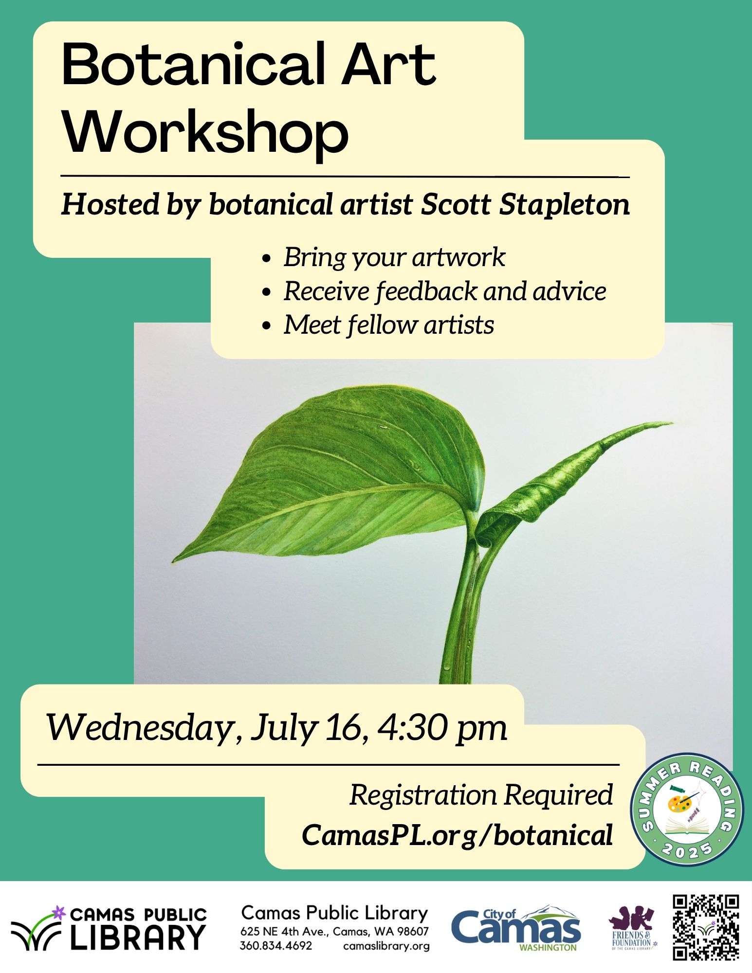 Camas Public Library 625 NE 4th Ave., Camas, WA, United StatesBotanical artist Scott Stapleton will offere a Botanical Art Workshop at the Camas Public Library from 4:30 to 6:30 p.m. July 16. Participants are encouraged to bring any botanical-related projects they are working on for the group to discuss together. This event is intended for adults only. Registration is required at CamasPL.org/botanical or at 360-834-4692.