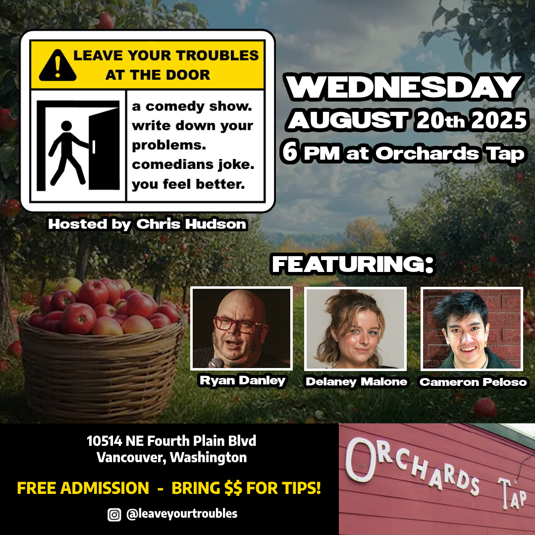 Orchards Tap 10514 N.E. Fourth Plain Blvd., Vancouver, WA, United StatesLeave Your Troubles at The Door is a completely improvised stand-up comedy showcase where the audience's problems help create the topics of the jokes that comedians riff on stage. Audience members anonymously write their problems / troubles down on pieces of paper, put them in a box before the show and then many of the […]