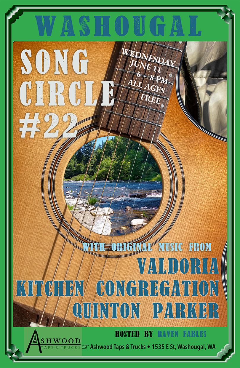 The next Washougal Song Circle is 6-8 p.m. June 11 at Ashwood Taps & Trucks, 1535 E. St., Washougal. All ages are welcome to hear singer-songwriters Quinton Parker, Valdoria and Kitchen Congregation with Hannah Morton. Craft beer and food are available to buy on site.