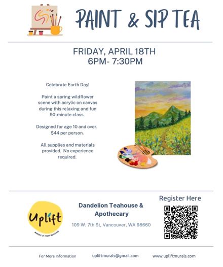 Dandelion Teahouse and Apothecary 109 W. Seventh St., Vancouver, WA, United StatesDandelion Teahouse and Apothecary, 109 W. Seventh St., Vancouver, will host "Paint and Sip Tea" from 6 to 7:30 p.m. April 18. Celebrate Earth Day with an evening of painting and sipping tea led by Uplift Murals and Team Building. The evening is geared toward adults but kids age 10-18 are welcome with an adult […]