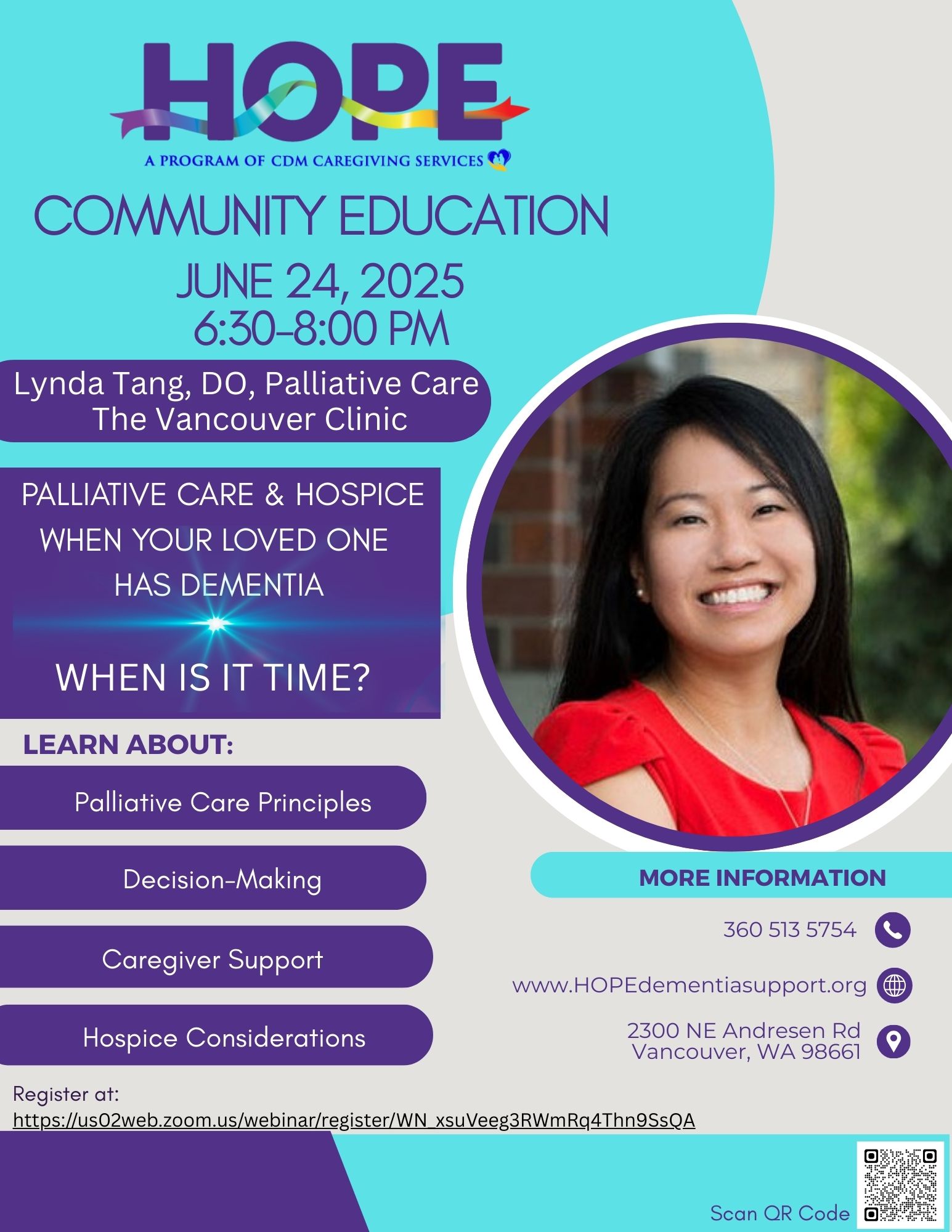 HOPE Dementia Support will host a free Zoom seminar, “Palliative Care and Hospice When your Loved One Has Dementia,” at 6:30 p.m. June 24. Vancouver Clinic palliative care physician Lynda Tang will discuss palliative care principles, hospice considerations, decision making and caregiver support. Register at us02web.zoom.us/webinar/register/WN_xsuVeeg3RWmRq4Thn9SsQA or call HOPE Dementia Support at 360-513-5754.