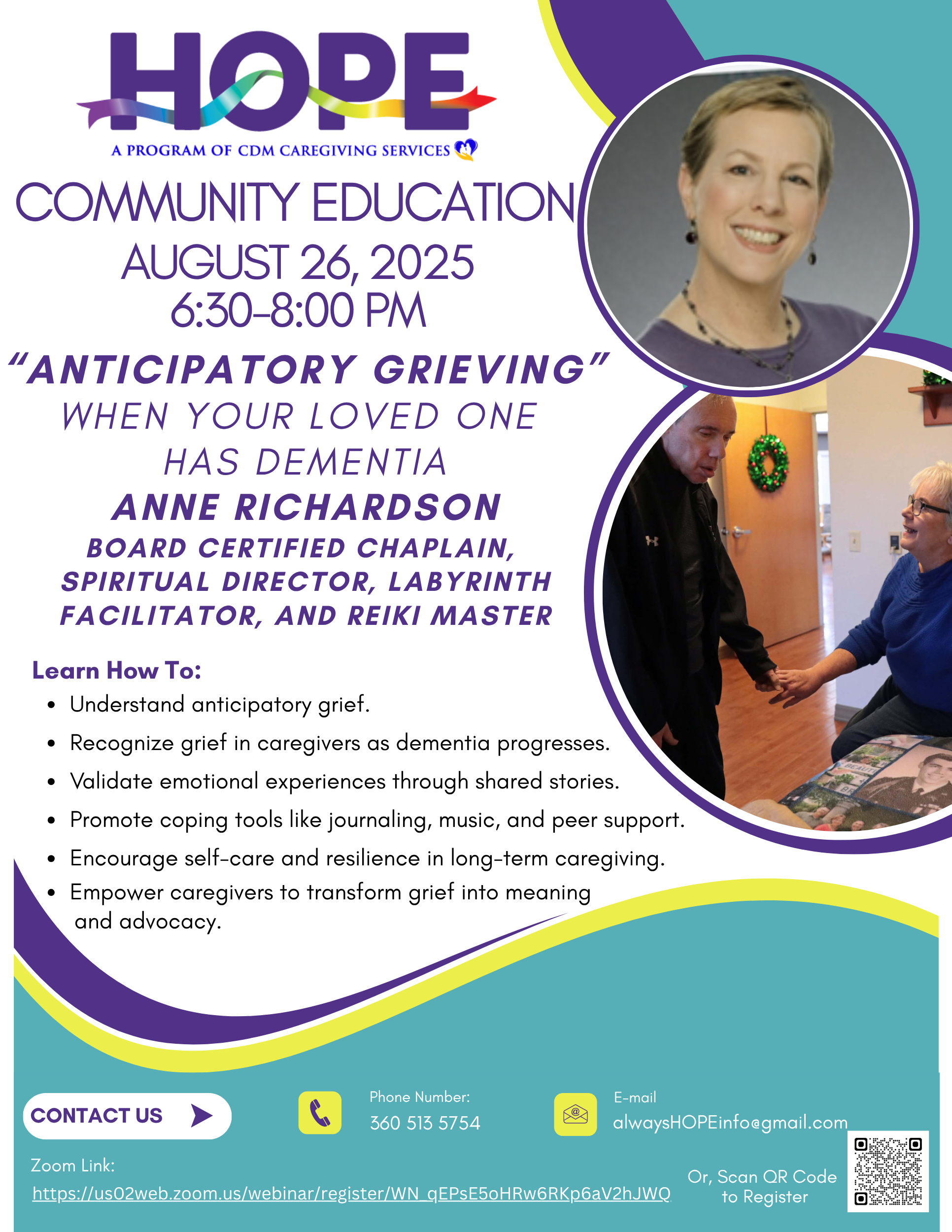 6:30 p.m. Aug. 26, HOPE Dementia Support will host a free Zoom seminar, “Anticipatory Grieving When Your Loved One has Dementia”, with Anne Richardson, a board-certified chaplain, spiritual director, labyrinth facilitator and reiki master. Richardson will be discussing anticipatory grief, coping tools, self-care and more. Register at us02web.zoom.us/webinar or call HOPE Dementia Support at 360-513-5754.