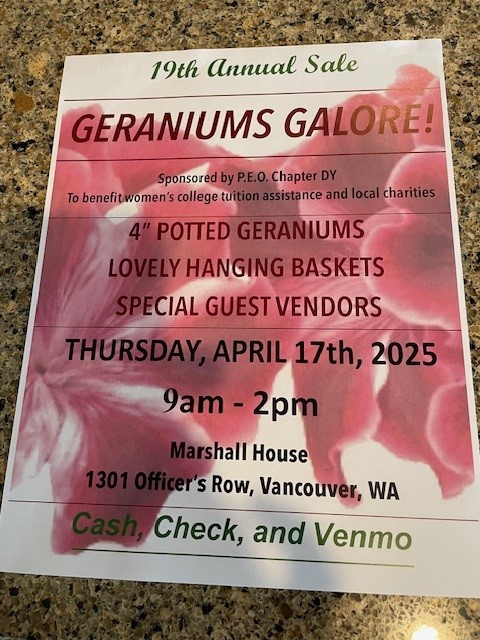 The Philanthropic Educational Organization Chapter DY is offering a geranium sale from 9 a.m. to 2 p.m. April 17 at Marshall House, 1401 Officer's Row, Vancouver. The sale will raise funds for women's college tuition assistance and local charities. Purchase four-inch potted geranium and hanging baskets and browse vendors. Cash, check and Venmo accepted.