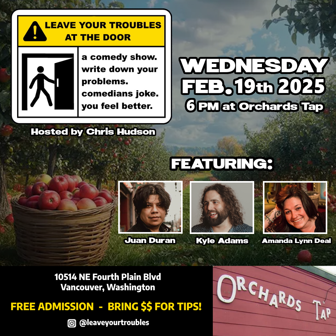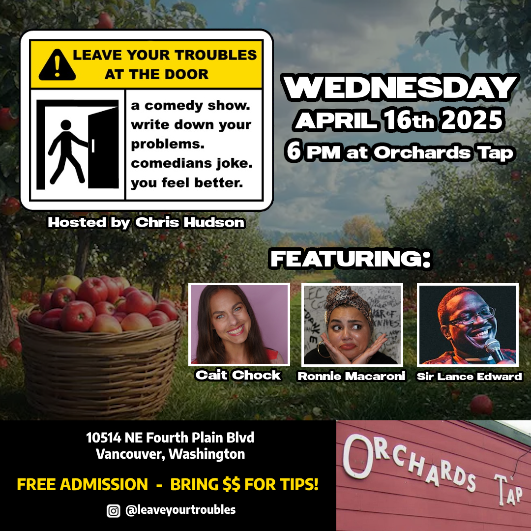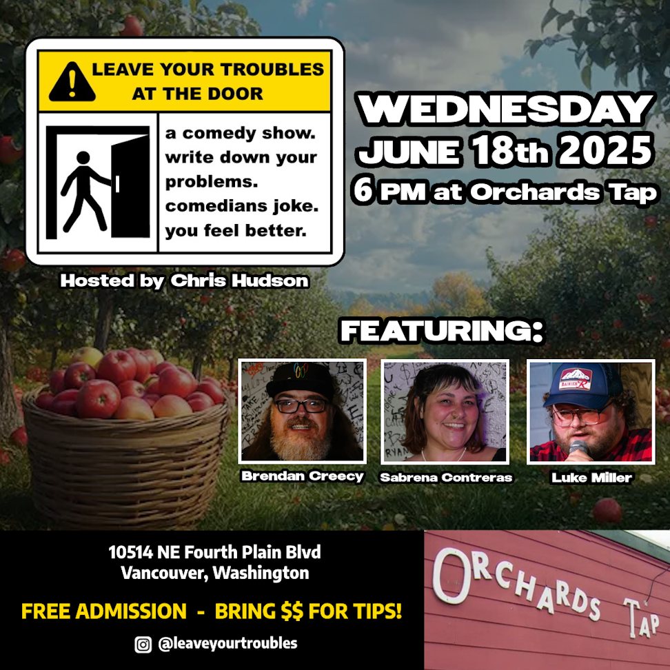 Orchards Tap 10514 N.E. Fourth Plain Blvd., Vancouver, WA, United StatesLeave Your Troubles at the Door, 6-8 p.m. Oct. 15 at Orchards Tap, is an improvised stand-up comedy showcase where the audience's problems create the topics of the jokes. Audience members anonymously write their problems down on pieces of paper, put them in a box before the show and comedians tackle those issues with on-the-spot […]