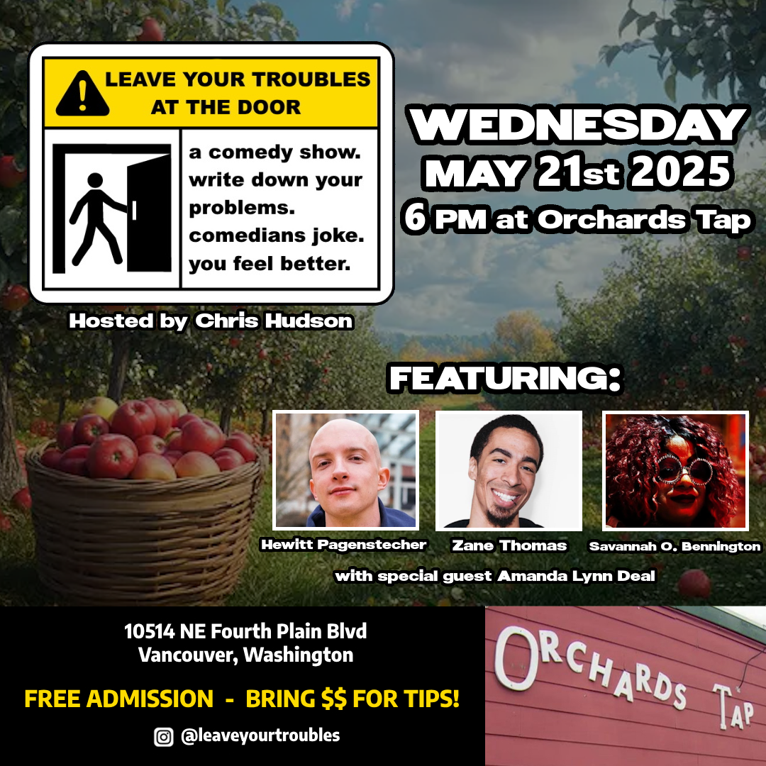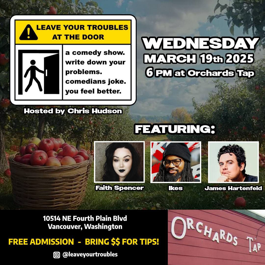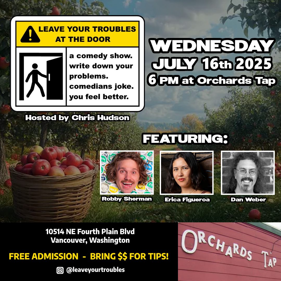Orchards Tap 10514 N.E. Fourth Plain Blvd., Vancouver, WA, United StatesLeave Your Troubles at the Door, 6-8 p.m. Oct. 15 at Orchards Tap, is an improvised stand-up comedy showcase where the audience's problems create the topics of the jokes. Audience members anonymously write their problems down on pieces of paper, put them in a box before the show and comedians tackle those issues with on-the-spot […]